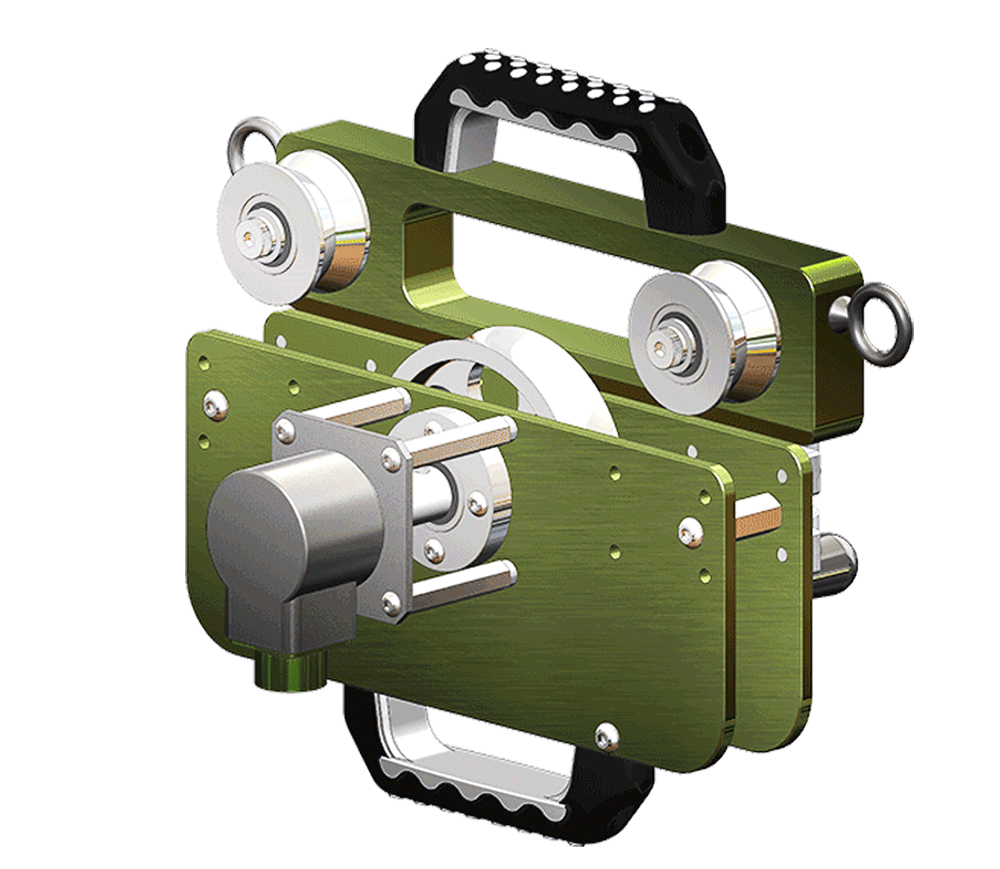 A cam lever mechanism makes opening and mounting the Cable Rider ™ easy. The handles and eyebolts give the user multiple options for tying it off and keeping it secure in one position while on a moving line. A stiff-arm is also available which attaches to a ball joint on the Cable Rider then clamps to another solid structure to keep the Cable Rider ™ in position (typically in front of the existing measurement/tension system).